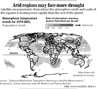 Over the past 27 years, the high-speed air currents that steer storms to temperate zones in both hemispheres have shifted about one degree toward the poles, or about 70 miles, scientists estimate in a paper published today in the journal Science. "This gives direct, observational evidence of massive atmospheric circulation changes," said University of Washington climate scientist Qiang Fu, the paper's lead author. The researchers stopped short of attributing the shift to global warming. It's also impossible to say whether the shift is playing a role in recent droughts in the so-called subtropics, including the American Southwest, the Middle East and the Mediterranean, said co-author John M. Wallace, also a UW atmospheric scientist. But if the jet streams continue to migrate away from the equator, wider swaths of the planet will almost certainly become hotter and drier, Wallace said. "If the jets move another two or three degrees over the course of the next century, that would be enough to have a significant impact on climate in the subtropics." More study is needed to sort out possible contributions from natural cycles, random fluctuations and temperature increases caused by greenhouse gases from cars and industry, Wallace added. But the finding meshes with predictions of global-warming models, said Isaac Held, a senior researcher for the National Oceanic and Atmospheric Administration (NOAA) who was not involved in the study. The Seattle team analyzed atmospheric temperature data collected by weather satellites between 1979 and 2005. The data had long been cited by global-warming skeptics because it seemed to show the atmosphere wasn't heating up in tandem with Earth's surface. |
