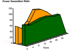 Introducing the VRB to this scenario produces an effective and commercial energy storage solution. The power generating utility will have the ability to level the generated output by storing energy in low demand times and using the stored energy at peak demand times. This allows management of sudden demand changes by having stored energy on standby in the VRB. The ability to recover power instantaneously from the VRB allows significant cost savings by reducing the amount of power generated as the spinning reserve. (10% – 15% saving)