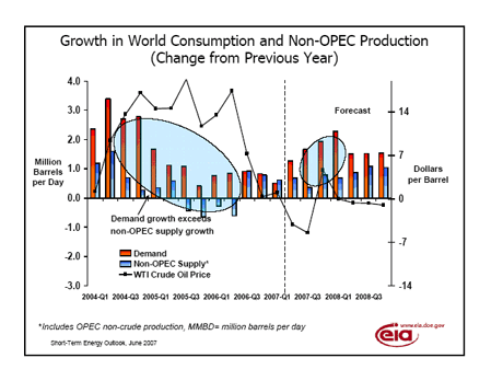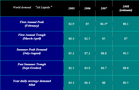 It might have been high last year but Boy ! Have we got news for you next year ! The slump in demand forecast for last year didn’t happen, as the world’s regular Teflon Herd consumer kept on gulping their gasoline, gasoil, cooking kerosene, aviation kerosene and other fuels, but this year everything is different. Rivaling each other in unreal forward demand estimates, and joined also by OPEC’s Secretariat for whatever dark or hidden motive, by the investment banks and by almost all analysts, the forecasting crowd today claims world oil demand in 2008 is “unlikely” to grow more than 1.1 mln b/d to 1.3 mln b/d.