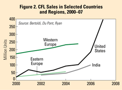 - China's production of CFLs tripled from 750 million units in