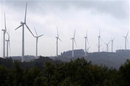 Power-generating windmill turbines form a wind farm on Backbone Mountain
