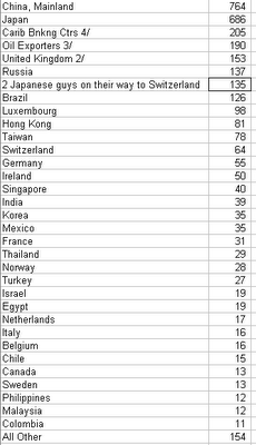 "Chiasso, Italy - Italian finance police on Friday reportedly arrested two men crossing into Switzerland carrying what looks to be around 135 billion dollars worth of US government bonds, potentially the biggest smuggling attempt in history. The Guardia di Finanza was not able to confirm if the bonds were genuine." What's the big deal? Some guys got caught with some bonds. "The men face potentially very stiff penalties should the securities be found to be genuine, as it is illegal to carry sums over 10,000 euros (around 14,000 dollars) into a non-EU country without declaring it." Stiff penalties? Earth to Earth Times - is there anyone there? 135 billion dollars worth of US government bonds. A couple of guys (supposedly from Japan)? This is either a massive hoax, the largest counterfeit operation in the world, or the largest theft/embezzlement ever. If the latter is true, this has to involve hundreds of people in high positions at governments and/or banks. The scandal will dwarf most financial scandals. This is every conspiracy theory buff's dream. Watch the blogs light up! Stolen TARP money, secret Swiss organizations (see post below), the Freemasons, embezzled online poker money, etc. Some of these theories could actually be possible - like the North Koreans forging treasury certificates in desperation (easier than forging currency). We'll be following this story closely as it develops. The two guys with some US Treasury certificatesThe two guys caught in Italy with some US Treasury certificates, let's put things in perspective: Here are the foreign holders of US Treasury debt: