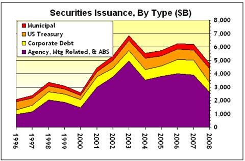 Figure 6: Issuance of Mortgage and Asset Related Securities – Another Proxy For The Shadow Banking System. Data: G. Gorton, “Slapped In The Face By The Invisible Hand”, 2009 The wholesale, or institutional, banking panic of 2007 began with a home price decline that weakened the credit of privately issued securitizations that lacked any government backing or guarantee. As summarized in the table below, the Shadow Banking Panic of 2007 shares many similarities with the numerous banking panics that plagued the late 19th and early 20th centuries – except that it is an institutional (or wholesale) panic among large investors, rather than an individual (or retail) panic among small depositors.