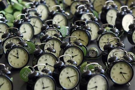 Clocks are seen during the performance "tck tck tck" by Global Campaign
