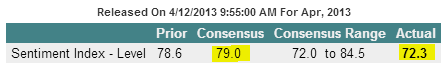 MarketWatch: - The University of Michigan-Thomson Reuters consumer-sentiment gauge dropped to a preliminary April reading of 72.3 -- the lowest result since July -- from a final March reading of 78.6, reports said Friday. Economists polled by MarketWatch had expected a preliminary April reading of 79.3. However, consumers have faced negative news on jobs and federal spending.