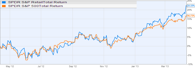 With the current improvements in the labor and housing markets, investors have piled into retail-focused companies. However, today's retail sales surprise to the downside (see chart on Twitter) points to potential weakness in the retail sector. This was followed by another consumer-related surprise - the UMichigan Consumer Sentiment, which came in materially below expectations.