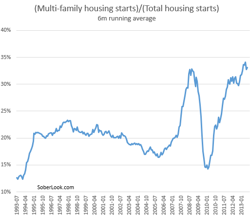 There is another trend that is probably not helping with conversion of new home activity into the economic growth some were expecting. Multi-family units represent an increasing proportion of total housing starts.