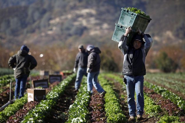 Celso Jacobo carries the harvested lettuces back to the truck at the Full Belly Farm, Thursday November 19, 2013, in Guinda, Calif. Full Belly Farm has approximately 400 acres and serve thousands through farmers markets and online. Small farm advocates worry that new food safety rules proposed by the FDA will hurt the small farmers and unravel farm conservation programs.