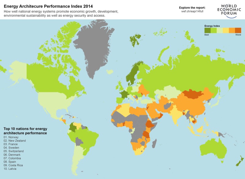 "Resource wealth or economic development alone do not guarantee high performance on the Index," said Roberto Bocca, senior director, head of energy industries, World Economic Forum. "For an effective energy system countries need to focus on all three sides of the energy triangle -- environmental sustainability, security of supply and affordability." Norway tops the rankings, followed by New Zealand and France. The top 10 is dominated by EU and OECD countries with the exception of Costa Rica and Colombia; 41 percent of energy supply in the top 10 countries comes from low carbon energy sources, compared to a global average of 28 percent. European Union and Nordic countries top the rankings, underscoring the ability of service sector economies to prioritize investment in the development of low-carbon economies and address climate change through renewables and energy efficiency. The drive for sustainability has meant some trade-offs in energy affordability, underpinning the policy debate in Europe as utilities and consumers struggle with pricing and an uncertain policy landscape. The performance of BRICS countries (Brazil, Russia, India, China and South Africa) is impacted by the prevalence of energy- and emission-intensive industries. Ranked 21st, Brazil is the top performer in this cluster, extracting 50 percent more GDP per unit of energy use than the average of the other BRICS countries. China, the world's largest energy consumer, has successfully increased access to energy for its population but continues to struggle with rising energy imports and pollution levels. ASEAN's performance highlights the disparity in resource allocation across the region where energy systems are fossil-fuel dominated. The demand for energy is expected to rise and put further strain on these energy systems. Interconnections in the gas and electricity systems through the ASEAN 2015 integration plans will play a key role in addressing these challenges. Performance across North America shows contrasting circumstances, from the import and fossil fuel dependence of the Caribbean nations, to the resource wealth of Canada, the United States and Mexico. "…there is no single way forward; each country must work with its own resources and constraints, making difficult choices and trade-offs," said Arthur Hanna, managing director, Energy Industry, Accenture, and member of the World Economic Forum's Global Agenda Council on New Energy Architecture. "The Index helps nations take stock of their energy transition challenges and address key barriers to success, such as market distorting subsidies, continued uncertainty around energy policy and funding for research and development of new energy sources and technologies." For more: