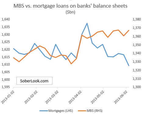 1. Loans on banks' balance sheets do not represent the entirety of credit creation. Loans originated by banks increase deposits, but banks often sell some loans into the shadow banking system, such as Fannie and Freddie. A material portion of these mortgages then ends up back on banks' balance sheets in the form of Agency MBS. These securities are exempt from the Volcker Rule, allowing banks to hold substantial amounts. That process reduces total loan balances without reducing deposits, thus contributing to the divergence in the chart above.