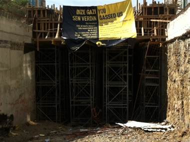 A banner saying "You Gassed Us," hangs over a halted construction site in Istanbul's Taksim Square.