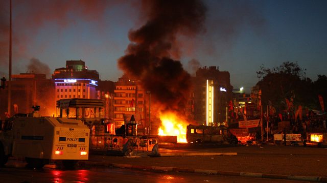Hundreds of protesters remained in the park, clearing up after trying to fend off tear gas, followed by an early morning storm that blew down tents and soaked bedding and blankets. At the park's entrance on Taksim Square, a massive barricade of wrecked cars and construction material stood as rudimentary protection from the police.