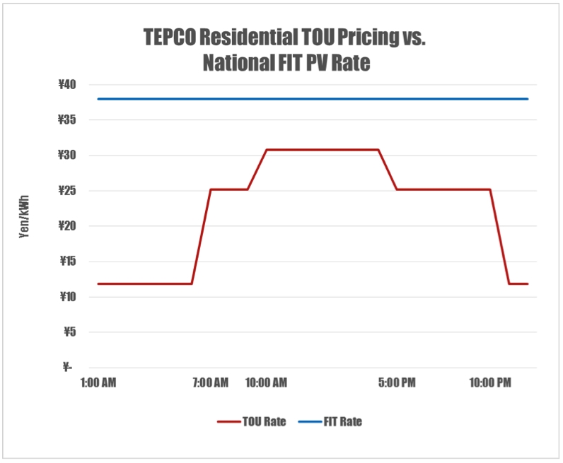 May 14, 2013 San Diego, CA -- In the past, a PV system with battery storage was associated with the off-grid system — not connected to the utility grid. The battery stores the energy produced by the PV system and when the sun goes down, electricity is drawn from the battery. In Japan, the battery became attractive to store electricity from "the grid," to reduce electricity bills. After the devastation of the Tsunami and nuclear meltdown in Mach 2011, Japan became painfully aware of the importance of both safety and maintaining a steady supply of electricity. The combination of a PV system and battery storage gives consumers the ability to produce, store and supply electricity throughout the day at their own home for power outages and emergencies. However, the system can bring economic benefits — electricity bill reduction — during normal days. Like California, utilities in Japan offer Time-of Use (TOU) rates. How homeowners can reduce electricity bills can be illustrated by using Tokyo Electric Power Company’s (TEPCO) current (non-summer) TOU rates for all-electric homes with a PV system.