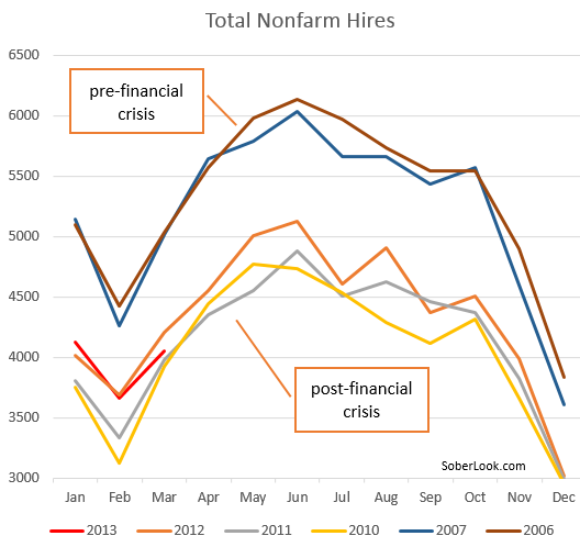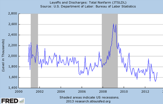 How is it possible that other labor market metrics are showing stabilization while hiring has not materially improved? The answer has to do with declining numbers of layoffs. According to the Bureau of Labor Statistics, the number of layoffs in the US has been at or below pre-recession levels since 2010.