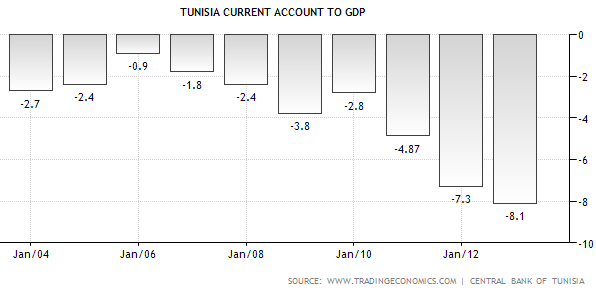 The nation's government budget deficit is also widening while foreign reserves have fallen sharply. As a result Moody's cut Tunisia's sovereign rating yesterday, with further downgrades possible.
