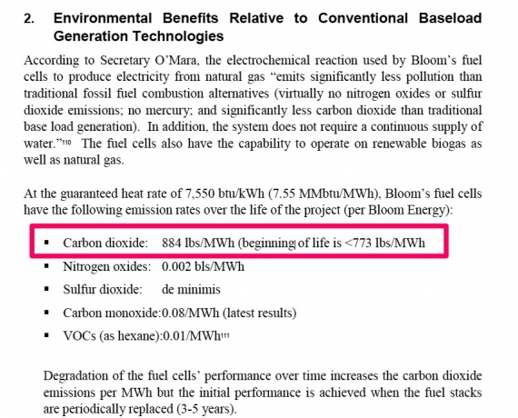 Leveen's revelation, from two public documents referenced below, is that Bloom's average CO2 emissions amount to 884 pounds per megawatt-hour. Leveen and others accuse Bloom of "greenwashing" in claiming that Bloom's fuel cells are a low-carbon power generation source or can count toward a renewable portfolio standard in a very loose interpretation of "renewable." (In a similar spirit, Arizona once wanted to count nuclear toward its RPS.)