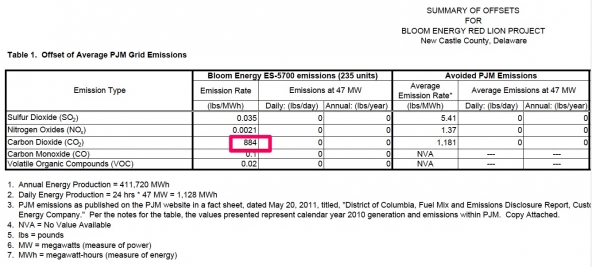 - Bloom's spokesperson said, "The 884 pounds per megawatt-hour is a conservative metric that was utilized for environmental permitting." The data sheet reads 773.