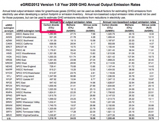 Here's a listing of GHG emissions by region from the EPA eGrid database from 2009.