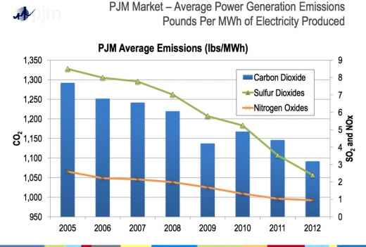PJM's average power generation emissions in 2012 were about 1,100 pounds of CO2 per megawatt-hour (see chart below).