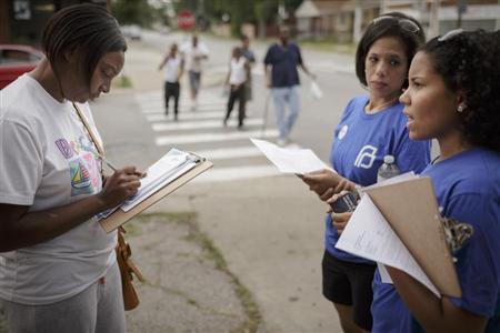 Get Covered America volunteers Cynae Derose (C) and Jalisa Hinkle (R) talk with Shirese Davis about the Affordable Care Act while canvassing a Chicago neighborhood, September 7, 2013. Credit: Reuters/John Gress