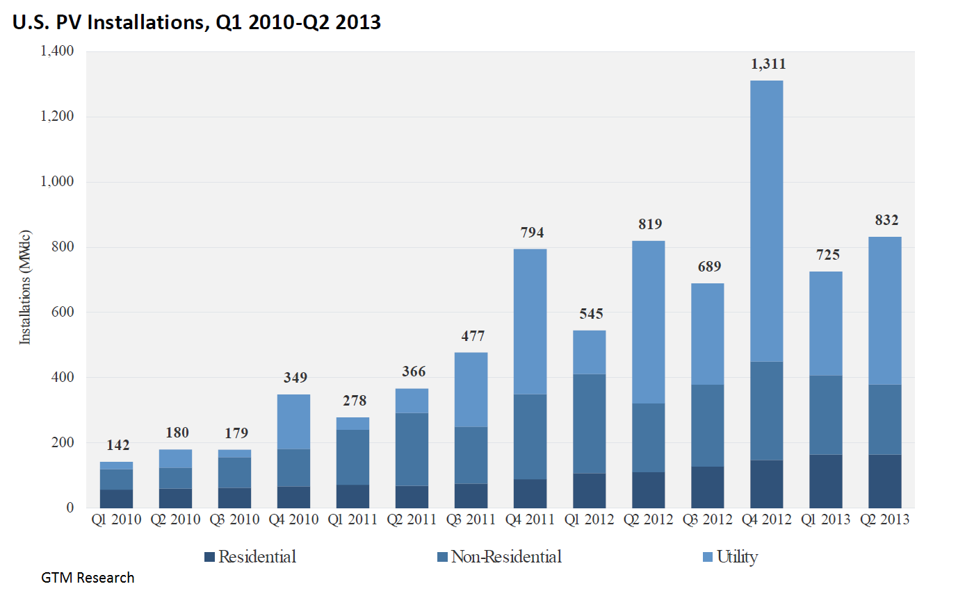 Showing continued growth in the market, the U.S. installed 832 MW of solar capacity in Q2 2013, representing 15 percent growth over the first quarter, making it solar's second best quarter ever, according to GTM Research and the Solar Energy Industries Association.