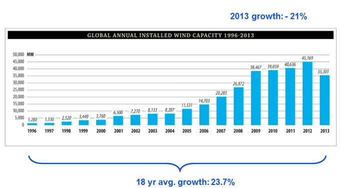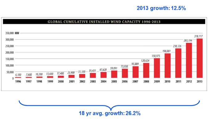 When we look at cumulative installed capacity for wind power, however, a much brighter picture emerges, according to the GWEC report. In total, installed wind power capacity grew by 12.5 percent in 2013. “Not bad growth in cumulative terms,” said Sawyer, who added, “actually if you exclude the U.S. from the equation, we had modest growth in most parts of the world last year.” The chart below (courtesy GWEC) shows cumulative installed capacity for wind power. Today the world’s installed capacity for wind power sits at about 318 GW.