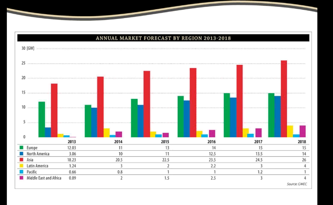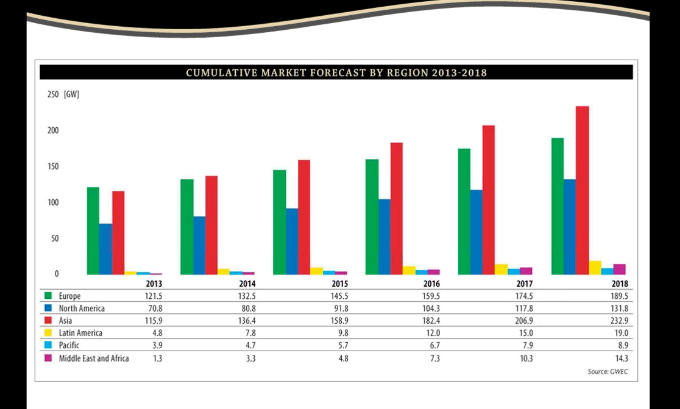 Wind Around the World Markets around the world will continue to install wind capacity with the biggest regions – Europe, North America, and Asia – still installing the lion’s share. In North America, Sawyer said that Mexico is a hot market for wind power. Sawyer explained that Mexico’s new energy reform legislation basically challenges the country to install about 2 GW of renewable energy capacity per year from now until 2024 to reach the target of 35 percent renewables by 2024 “and most of that is going to be wind,” he said. Brazil is expected to double its wind power installed capacity in 2014, according to Sawyer. The country has a total installed capacity of 4 GW now and plans to install that much wind power in 2014. “The cumulative impacts of auctions and the build-out of the grid that is happening now is going to facilitate some fairly dramatic growth in Brazil over the next couple of years,” he said, adding that depending on what happens in the country’s elections and if Brazil can bring more stability to its economy, “it could be much larger.” Another hot market for wind power is South Africa, according to GWEC. There is almost 1.2 GW of wind power either under construction or ready to start construction right now and another 800 MW that has been awarded a contract and is awaiting funding. “We expect [those 800 MW] to get financial close during the first half of this year,” said Sawyer. Sawyer said that the South African government has called for 9 GW of wind energy to be installed by 2030. Sawyer mentioned other African markets such as Tanzania, Kenya and Ethiopia as poised for good growth in wind power. Ethiopia, in particular, has “some of the best wind resources in the world and has a fully developed plan to get up to about 7 GW by 2030,” he said. Moving into Asia, Sawyer believes that there are many “potentially substantial” markets besides China, India and Japan. Even though it is one of the smallest in terms of population and electricity demand, Mongolia could be a very big wind market, said Sawyer. “There are tremendous opportunities for not only powering the growth in the country with the highest GDP growth rate in the world, but also exporting that power to China and through China to other countries in Asia,” he explained. Vietnam, Pakistan and Sri Lanka all have excellent wind resources, a need for power, and projects coming online in the near future, according to Sawyer. In addition, Thailand has “a very good regime” for wind power, he said. GWEC is watching the elections in India and remains optimistic that the country could end up with a much more “activist” government in terms of “developing the infrastructure that is necessary to spur significant growth in that very dynamic and growing economy,” said Sawyer. In Latin America, beyond Brazil GWEC is seeing positive signs in Chile, Uruguay, Nicaragua, Panama, Costa Rica and some of the smaller Caribbean islands. The charts at the bottom of the page (courtesy GWEC) show the annual and cumulative market forecasts by region from 2013-2018. Considerations for Manufacturers Downward price pressure on wind turbines will continue, according to GWEC. The drive to be more competitive than “the incumbents” and the continued oversupply of turbines will keep pressure on manufacturers, straining margins and forcing them into new markets. Sawyer said that many companies were “hurt over the last several years” because their domestic markets took a hit. “They are realizing that being based in a single home market is a dangerous strategy,” he said. Finally, unless and until there is a global carbon price, wind power won’t reach its maximum potential, said Sawyer. The 2015 climate meetings could result in such an agreement however even if one were to be put in place “we can’t expect that to have a major impact until sometime after 2020,” he said. Without a global climate agreement, GWEC will remain focused on regional markets and legislation. The drivers that brought wind to where it is today remain in place, he said. Energy security, cost stability, local economic development and job creation are still some of the benefits that wind energy offers. These are “increasingly prominent” said Sawyer. “And so we look forward to a strong signal from governments about our efforts to protect the climate but in the meantime we have to get on with it on a market-by-market basis,” he concluded.