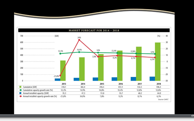 The Road Ahead - A Steady March into Emerging Markets Looking at the top 10 countries in terms of cumulative installed capacity, China is way out in front, followed by the U.S., Germany, Spain, India and the UK. Sawyer sees this changing with more emerging markets installing more wind power capacity going forward. “India will overtake Spain in the relatively near future and probably by the end of this year we’ll have Brazil displace Denmark in the top 10,” he said. Sawyer added that “a number of emerging markets [will start] slowing moving up the top 10 chart as the years go by.” One of the upsides of 2013 being a down year for annual installations is that 2014 is expected to be an excellent year for wind. GWEC predicts an annual growth rate of 34 percent in 2014 and a cumulative growth of 14.9 percent for this year with a total annual installed capacity of 47 GW. “After that we are projecting that things will return to more normal rates of growth,” said Sawyer. The chart below (courtesy GWEC) shows the market forecast for 2014 – 2018. Note that by the end of 2018, GWEC predicts that there will be just about 600 GW of installed wind power capacity, almost double where the industry is today.