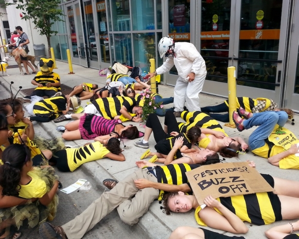 In Chicago, Swarm the Globe activists marched to the Lincoln Park Home Depot for a “die-in”: A “colony” of activists in bee costumes swarmed around a neonicotinoid-treated plant purchased from the store, then sprawled across the pavement outside the entrance. Afterward, the demonstrators returned the plant for a full refund.