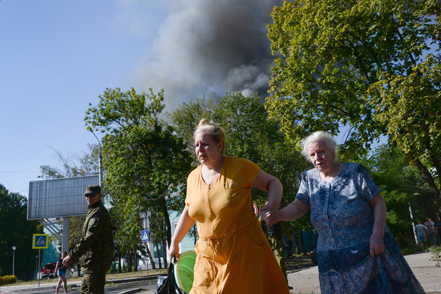 Women rush across the street after shelling in the town of Donetsk, eastern Ukraine, on Aug. 27, 2014. Russia, which denies involvement in a conflict that’s claimed more than 2,000 lives, faces more sanctions if the escalation of fighting continues, according to French President Francois Hollande and German Chancellor Angela Merkel. “Russia can’t at the same time aspire to be an accepted power of the 21st century and not respect the rules,” Hollande said at an annual meeting of French ambassadors in Paris today. Merkel said yesterday that further penalties may be needed “to give added political weight to our demands.” Jen Psaki, the U.S. State Department spokeswoman, cited the reports of fresh fighting, telling reporters in Washington that “these incursions indicate a Russian-directed counteroffensive is likely under way in Donetsk and Luhansk.” Putin’s spokesman, Dmitry Peskov, said yesterday “this information doesn’t correspond with reality.” Today, Peskov declined to comment on Ukrainian claims of an invasion or rebel statements about Russian soldiers joining the war. War VacationThe prime minister of the self-proclaimed Donetsk People’s Republic, Alexander Zakharchenko, said “many” retired Russian military personnel are in the region to fight alongside rebel forces, seeing it as their “duty.” There are also “many” active-duty Russian soldiers who choose to join the fight when they are on leave, he said on Russian state television.