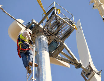 worker makes adjustments to a wind turbine at Black