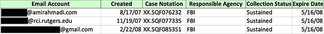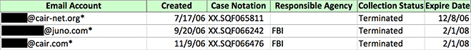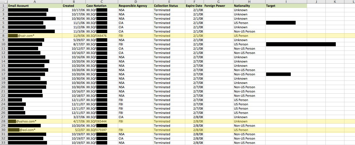 The vast majority of individuals on the “FISA recap” spreadsheet are not named. Instead, only their email addresses are listed, making it impossible in most cases to ascertain their identities. Under the heading “Nationality,” the list designates 202 email addresses as belonging to “U.S. persons,” 1,782 as belonging to “non-U.S. persons,” and 5,501 as “unknown” or simply blank. The Intercept identified the five Americans placed under surveillance from their email addresses. It is unclear whether the government obtained any legal permission to monitor the Americans on the list. The FBI and the Justice Department declined to comment for this story. During the course of multiple conversations with The Intercept, the NSA and the Office of the Director of National Intelligence urged against publication of any surveillance targets. “Except in exceptional circumstances,” they argued, surveillance directly targeting Americans is conducted only with court-approved warrants. Last week, anonymous officials told another news outlet that the government did not have a FISA warrant against at least one of the individuals named here during the timeframe covered by the spreadsheet. The FISA process was enacted in 1978 in response to disclosures that J. Edgar Hoover and a long line of presidents from both parties had used U.S. intelligence agencies to spy on dissidents and political enemies. Intended to allow authorities to covertly investigate suspected spies or terrorists on U.S. soil, the surveillance is often used simply to gather intelligence, not to build a criminal case. The law was revised in 2008—in part to place limits on the controversial program of warrantless wiretaps initiated by George W. Bush after 9/11, and in part to legalize the program’s warrantless eavesdropping on Americans when they speak with foreign surveillance targets. Under current law, the NSA may directly target a “U.S. person” (an American citizen or legal permanent resident) for electronic surveillance only with a warrant approved by the Foreign Intelligence Surveillance Court. Because the FISC operates in complete secrecy—only the Justice Department and the FBI are permitted to attend its proceedings on domestic surveillance—it is impossible to assess how the court applies the standard of “probable cause” in cases of suspected terrorism or espionage. But its rulings are notoriously one-sided: In its 35-year history, the court has approved 35,434 government requests for surveillance, while rejecting only 12. Law enforcement officials familiar with the FISA process told The Intercept that the FISC’s high approval rate is the result of a thorough vetting process that weeds out weak applications before they reach the court. The system, they added, seeks to balance what they consider to be the essential role of surveillance in protecting national security with the civil liberties of potential targets. The NSA issued a statement that reads in part: “No U.S. person can be the subject of FISA surveillance based solely on First Amendment activities, such as staging public rallies, organizing campaigns, writing critical essays, or expressing personal beliefs.” ![]() A selection from the FISA Recap spreadsheet; the highlighted entries are email accounts belonging to Nihad Awad (the cair.com address) and Faisal Gill (the Yahoo! and AOL addresses). But legal experts have long expressed concern that the secretive nature of the FISA process makes it impossible to know what level of evidence is actually used to authorize surveillance, precisely what it means to be an agent of a foreign power, or whether there is any effective oversight to protect civil liberties. “We have very little idea what this probable cause standard means in individual FISA cases,” says Patrick Toomey, a staff attorney for the National Security Project of the American Civil Liberties Union. “No FISA application or order has ever been publicly disclosed, even to a criminal defendant or his lawyer in cases where the government later brings charges based on that FISA surveillance.” A former Justice Department official involved in FISA policy in the Obama Administration says the process contains too many internal checks and balances to serve as a rubber stamp on surveillance of Americans. But the former official, who was granted anonymity to speak candidly about FISA matters, acknowledges that there are significant problems with the process. Having no one present in court to contest the secret allegations can be an invitation to overreach. “There are serious weaknesses,” the former official says. “The lack of transparency and adversarial process—that’s a problem.” Indeed, the government’s ability to monitor such high-profile Muslim-Americans—with or without warrants—suggests that the most alarming and invasive aspects of the NSA’s surveillance occur not because the agency breaks the law, but because it is able to exploit the law’s permissive contours. “The scandal is what Congress has made legal,” says Jameel Jaffer, an ACLU deputy legal director. “The claim that the intelligence agencies are complying with the laws is just a distraction from more urgent questions relating to the breadth of the laws themselves.” Government agencies have invoked a host of legal theories over the years to justify spying on Americans without obtaining individual FISA warrants. Prior to mid-2008, for example, the NSA could target Americans when they were located on foreign soil simply by obtaining an authorization from the attorney general. The NSA also relies on the so-called “FISA backdoor” to read the emails of Americans communicating with foreign targets without obtaining a warrant, and engages in the bulk collection of “metadata” from Internet service providers without individual warrants. In other cases, it can obtain a warrant against an entire organization—and then monitor the emails of ind