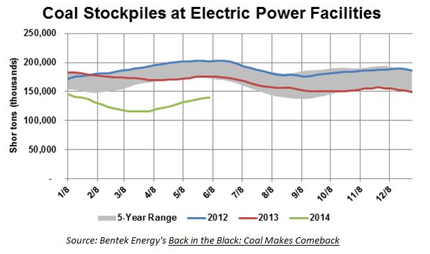 "Based on our analysis, coal is expected to remain a viable fuel source in the U.S. power sector, despite increased environmental regulation and competition from cheap and plentiful shale natural gas," said Michael Bennett, a Bentek analyst and the report's lead author. "This contrasts sharply with the past decade, during which coal's market share dropped by 12 percent." A major driver of heightened winter coal consumption was natural gas prices, which hit $7 per million British thermal units (MMBtu) several days this winter, according to the report. They also averaged $4.60/MMBtu at Henry Hub, the standard delivery point for the New York Mercantile Exchange (NYMEX) natural gas futures contract in the U.S. -- compared to $3.46/MMBtu during the winter of 2012-2013 and $2.75/MMBtu in winter 2011-2012. As a result, coal stockpiles at U.S. power facilities fell to the lowest levels since 2006. Stockpiles peaked in mid-June 2012, but plunged to 113 million short tons in March, compared to a five-year average of 177.9 million short tons. Reserves have since rebounded to 141.5 million, according to the report, but based on historical trends, are unlikely to stretch beyond 136 million short tons by the end of June -- about 18 million short tons less than the five-year minimum. For more: