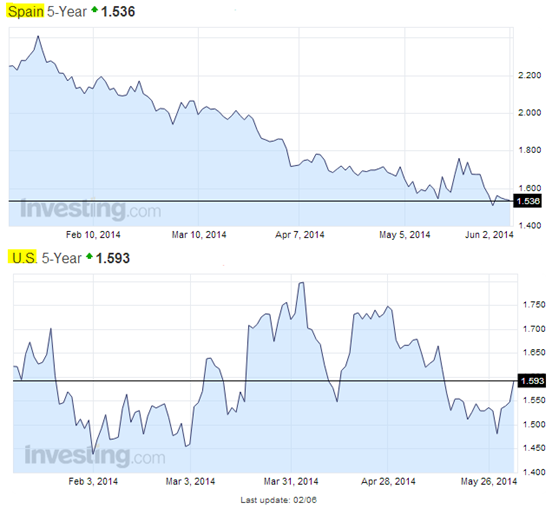On a related note, the chase for yield and the anticipation of fresh monetary stimulus in the Eurozone has created a rather distorted global rates environment. Spanish 5-yr government bond yield is now below the 5-yr treasury yield. Real (inflation-adjusted) yields in Spain are of course still higher than in the US. But just to put things into perspective, almost exactly 2 years ago Spain was staring down a potential collapse of its banking system and was actively seeking bailout funds.