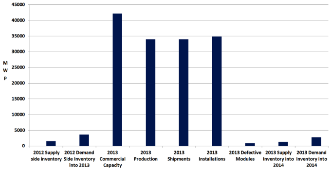Outsourcing has been a common practice in the photovoltaic industry since…always. Ignoring it in favor of reporting higher shipment numbers has been a common practice since…always. There is more outsourcing now than there was ten years ago because the industry is bigger. When the PV industry was at megawatt levels, outsourcing was at megawatt levels. Now that the industry is at gigawatt levels, outsourcing is at gigawatt levels. Today’s outsourcing is also more acceptable — in the past everyone did it quietly, today it is out in the open. Yet despite this openness and acceptability, double counting continues and the industry continues to be oversized. Figure 1 presents the various metrics that make up the PV industry during a calendar year with the exception of grid connections. These metrics are supply and demand inventory, commercial capacity, production, shipments, installations and defective modules. Think of production and shipments as conducting a little dance in and around inventory levels. That is, production can be lower than shipments depending on inventory levels. Production can also be misreported, that is, shipments are sometimes used as a stand-in for production and vice versa. In breaking industry activity down into its various components (except for grid connections) it appears as if should be easy to correctly size the PV industry's annual activities. Nope. Figure 1: PV Industry Metrics, 2013