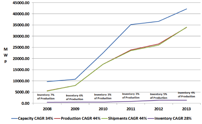 The Shipment Counting Shell Game A shell game is a now-you-see-it-now-you-don’t trick of evasive maneuvering. The rules (such as they are) consist of this: there are three cups and one small object such as a stone. The stone is placed underneath the cups, the cups are shifted around and everyone places bets as to where the stone will end up. Shipments of PV cells/modules are counted in order to arrive at the correct business size of the industry during a specific calendar year. The point is to accurately size the megawatts based on the technology developed and manufactured at point A followed to its arrival at point B; everything from point B on is a new count. Most manufacturers buy from other manufacturers and many include what they buy as their own production or in their shipment count. Manufacturers with wafer capacity and module assembly capacity send out their wafers for tolling and then assemble the cells in modules in-house. For example, manufacturer A ships 1-GWp of wafers to Manufacturer B who returns 1-GWp of cells to Manufacturer A. Both manufacturers report shipments of 1-GWp of PV cell technology and the PV industry is oversized by 1-GWp. Another way in which shipment numbers are inflated is when subsidiary relationships are unclear and nontransparent. In this case, Manufacturer A ships 100-MWp to a wholly owned subsidiary that may or may not install the technology and may even ship it back to the parent. In this way and over the course of many such exchanges the PV industry can also be oversized, significantly. Why This Is Dangerous for PV The PV industry has been experiencing accelerated growth for quite a few years — not always profitably. It has also been underutilizing its available commercial capacity for quite a few years. In 2013, capacity utilization for the PV industry was 82 percent — based on shipments to the first point of sale. This is a vast improvement over the past few years during which capacity utilization fell at times below 60 percent. Overtime, the systematic oversizing of PV industry output, whether through outsourcing or through shipping to subsidiaries, has made the industry look significantly more successful than it is and helped (along with too low prices) bring about the end of most of its incentives. Conventional energy, of course, does not need to worry about its success interfering with its ongoing incentives and subsidies. Pragmatically, stakeholders all along the PV value chain have a vested interest in having access to data about capacity, production, shipments and inventory that is as accurate as possible — for business planning purposes. Successful strategies require good data. Unfortunately, shipment reporting has often been a matter of saving face and looking successful more than arriving at an understanding of what is really happening. Think of it this way: you are wandering through a shopping mall and you come across a map of the facilities with a helpful icon indicating where you are in terms of the other stores as well as your destination. The helpful icon typically reads: You are here. So, now that you know where you are, you can figure out how to get to where you are going, or, you can decide to go someplace else entirely. If the helpful icon pretended you were further along, it would not be very helpful. The point of shipment and production reporting is to offer accurate information as to where the industry is at a certain point in its history so that it can develop a strategy to get where it wants to go. The PV Industry Is Here Figure 2 offers capacity, production shipments and inventory from 2008 through 2013. During this period PV industry capacity to produce commercial c-Si and thin film modules increased by a compound annual 34 percent with production and shipments increasing by a compound annual 44 percent.