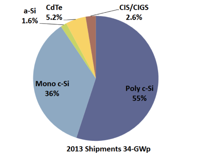 Figure 3 presents technology (c-Si and thin film) shipment market shares for 2013. Crystalline technologies had a 91 percent share of shipments in 2013. Figure 3: Crystalline and Thin Film Shipment Shares 2013