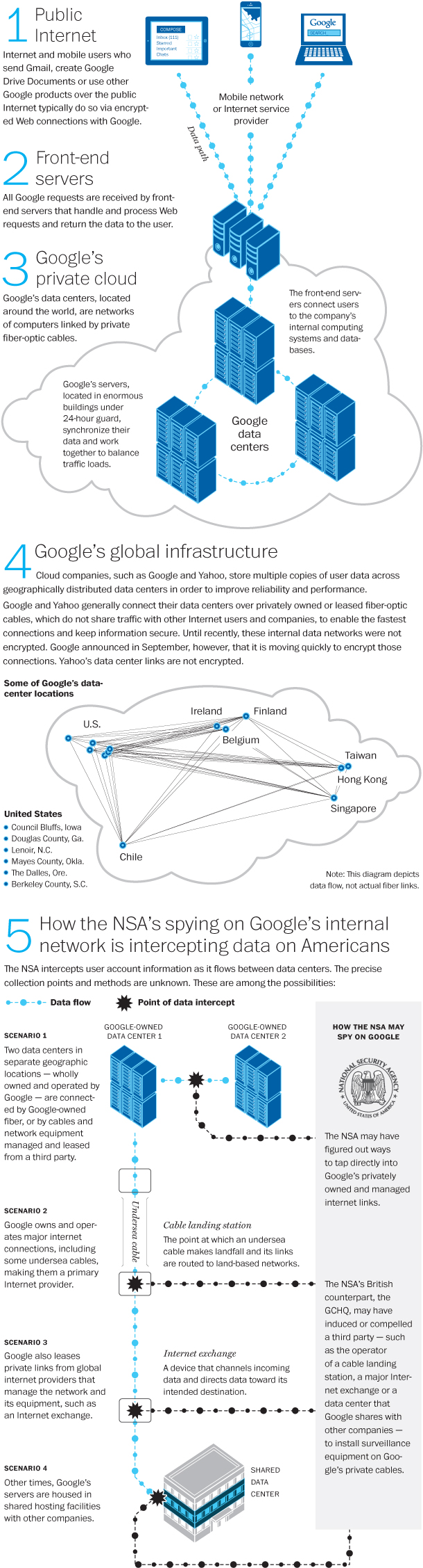 The NSA, working with its British counterpart, the Government Communications Headquarters (GCHQ), secretly taps into the internal networks of Yahoo and Google, the two biggest Internet companies by overall data traffic. The operation intercepts information flowing between the enormous data centers that those companies maintain around the world. In general, Google and Yahoo use privately owned or leased lines to synchronize their data centers. This graphic shows how the NSA and GCHQ break into those internal networks, using Google’s as an example. Less is known about Yahoo’s networks, but the NSA operations are thought to be similar.