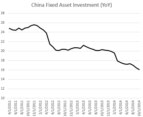 Fixed asset investment growth shows a similar slowing pattern - now growing at 16% per year.
