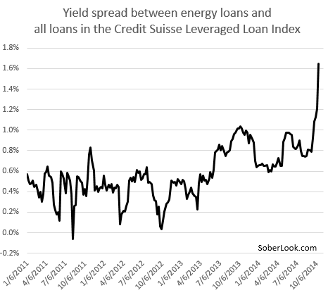 A significant number of middle market energy firms in the US - many funded via private capital (above) - are highly leveraged. The leveraged finance markets are becoming quite concerned about the situation - even for larger firms with traded debt. Here is the yield spread between the energy sector loans in the Credit Suisse Leveraged Loan Index and the index as a whole.