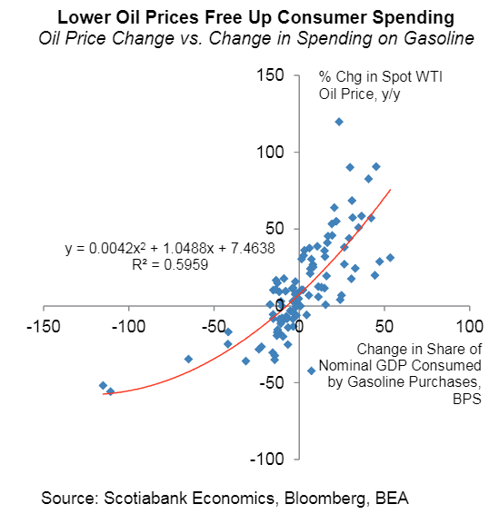 Furthermore, with gasoline prices lower, it is unlikely that consumers will be buying significantly more of it than they have been. Historically when oil prices fell, gasoline consumption in dollar terms also fell. Dollars saved on fuel will be redirected elsewhere in the economy.