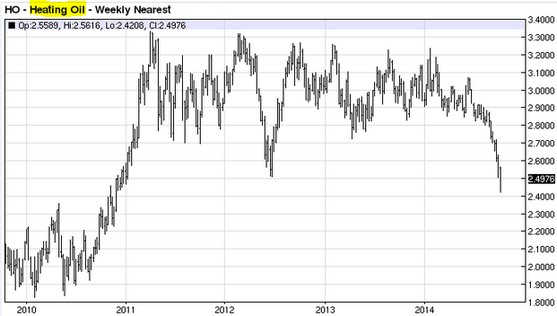 The US consumer is not only about to benefit from materially lower gasoline prices (see chart), but also from cheaper heating oil.