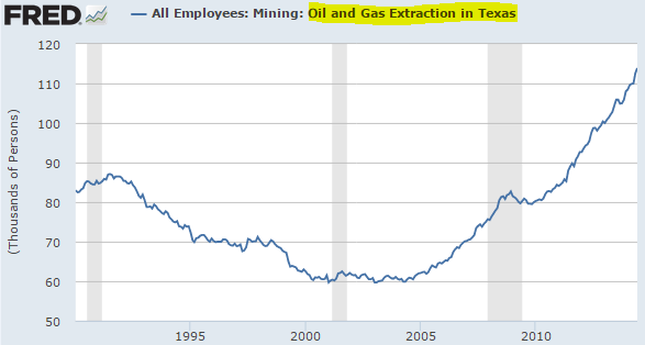 To put this into perspective, here are the jobs directly generated from Texas oil and gas extraction in recent years. And this does not include the thousands of jobs that support this industry. Such trend is unlikely to continue if oil prices remain at current levels or fall further.