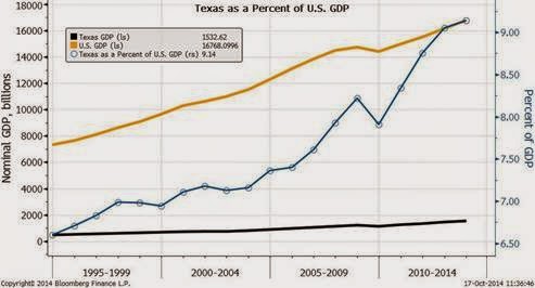 The US has become a major energy producer, with the sector partially responsible for improving economic growth and lower unemployment in recent years. As an example here is the GDP of Texas as a percentage of the US GDP. This trend is driven in part by the recent energy boom in the state.