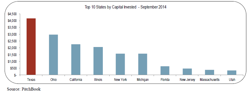 If oil prices remain under pressure, this boom could soon be in jeopardy. While large US energy companies are sitting on a great deal of cash, at some point they will begin to cut portions of the higher cost development and production. And private investment into energy and oil services firms, which has been brisk lately, is likely to moderate. For example, here is the private debt and equity capital flowing into various states last month.