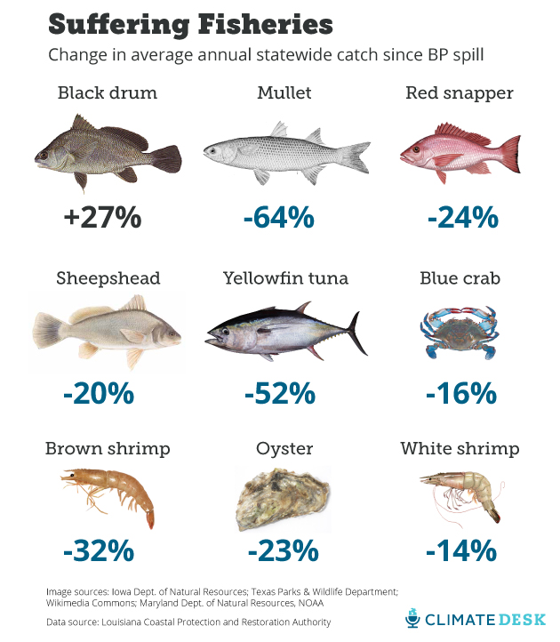 For its part, BP blames the oyster damage on the state of Louisiana's freshwater diversion, a fact "those who attempt to pin blame on BP have utterly failed to recognize," the company said in a statement. Last year was Tesvich's worst haul on record. This year has seen some improvement, but Tesvich's harvest is still down over 30 percent from before the spill, with profits down 15-20 percent even though the smaller yield has doubled the price for a sack of oysters from $25 to $50 since 2010. The catastrophe was not limited to oysters. With untold millions of barrels of oil spilled into the gulf (a federal court in New Orleans is set to rule on the exact volume in January), the ecological fallout was swift and severe, affecting everything from deep-water invertebrates at the foundation of the food chain to tuna to cetaceans (whales and dolphins). New evidence is emerging that links an ongoing, severe die-off in the gulf—more than 1,000 cetaceans have washed ashore dead since the event began in spring 2010, with scientists scrambling to understand why—to oil pollution. In fact, eight out of nine commercial fisheries tracked by the state have lower annual average catches than prior to the spill*: