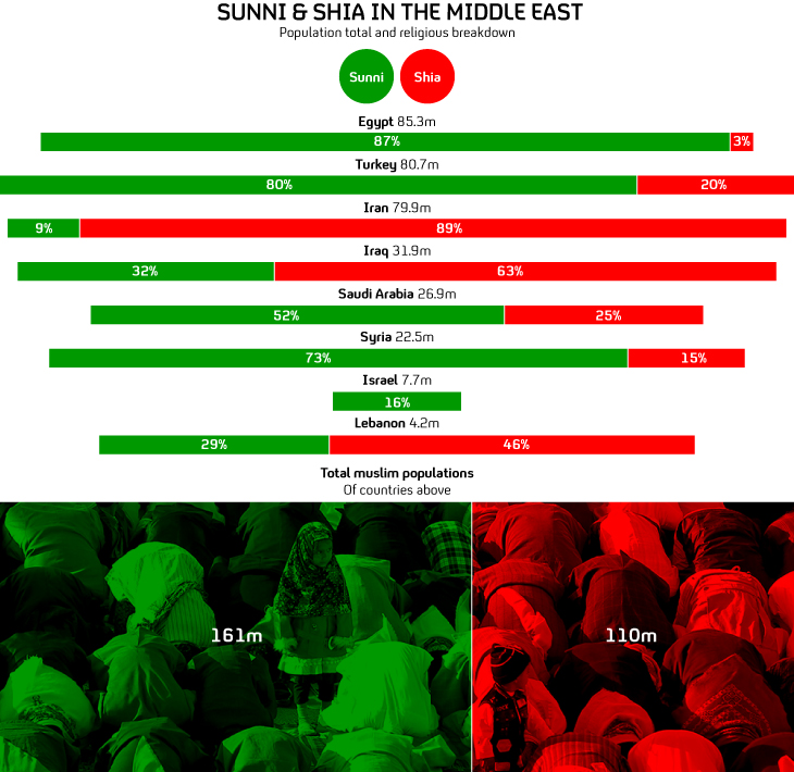 Geographically, the Sunni/Shia picture differs across the Middle East and the rest of the world (see graphic, above). Sunnis are the more dominant form of Islam - at least 80 per cent of Muslims worldwide. Some Sunni dominated countries include Saudi Arabia, Egypt, Turkey and Syria (see more on Syria, below).
