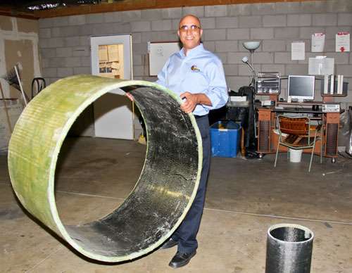 Ehsani’s InfinitiPipe addresses this problem by moving the manufacturing process to the site itself. He had originally been working on a method to reinforce existing pipes using composite materials. This led to his creating a method for making composite pipes that involved wrapping layers of carbon fabric and plastic honeycomb around a mold called a mandrel. As the pipe was partially finished, it would be slipped down the mandrel while the next length was made.