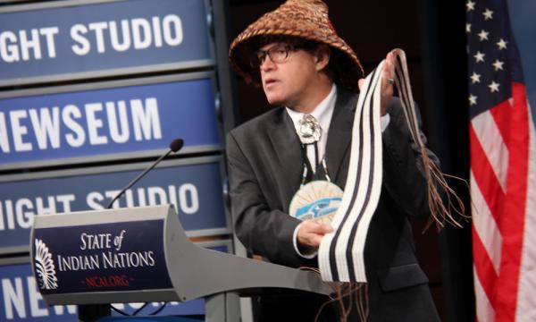 The National Congress of American Indians President Brian Cladoosby (chairman of the Swinomish Nation) delivered the State of Indian Nations Address Thursday in Washington, D.C. at the Newseum Knights television studios to a full house of members of Congress, senior Administration officials, and leaders of tribal nations. The event, which was livestreamed on the NCAI channel, was viewed all over Indian country with a reported 50 or more ‘viewing parties’ all over the country. In addition to Cladoosby’s call on Congress and the Obama Administration to act to improve tribal economies, invest in education, and support innovation, Senator John Barrasso (R-WY) the new chair of the Senate Committee on Indian Affairs, delivered the Congressional response. In his opening, President Cladoosby optimistically remarked on the growth of Indian country but mentioned that in order to foster continued growth we would need to tear down further barriers. “Indian country is leading. Indian country is innovating. Indian country is growing. And the state of Indian nations grows stronger by the day.” “Today, I bring a simple message from the tribes of the 21st Century: We must tear down barriers to growth, simplify regulations that are limiting opportunities, and acknowledge that tribes have the capability as governments to oversee our own affairs,” said Cladoosby. “Congress and the Administration need to find ways to help bring federal agencies out of the 19th Century and into the 21st Century. We need them to be partners for growth and not barriers to growth.” When Cladoosby remarked on the historic visit by President Obama to the Standing Rock Sioux Nation last year, he mirrored the words of President Obama by extending a personal invitation to Speaker Boehner (R-OH), Leader Nancy Pelosi (D-CA), Majority Leader Mitch McConnell (R-KY), and Minority Leader Harry Reid (D-NV) – as well as every Member of Congress to visit Indian country in 2015. “Make it a goal to come to Indian country this year,” said Cladoosby. Before outlining the plan and discussing the top level priorities of the NCAI Cladoosby personally remarked about the appreciation he had for his own father and for the contributions of the recently passed activist and leader Billy Frank Jr. “As Billy put it, he wasn’t a policy guy, he was a getting arrested guy,” to which Cladoosby made the light hearted comment that though Billy was arrested more than 50 times for exercising treaty rights, Cladoosby would not be able to match the arrest record. Cladoosby stated the priorities for the NCAI in 2015 to include their recent 130 page report The FY 2016 Indian Country Budget Request; Promoting Self-Determination, Modernizing the Trust Relationship, outlining a plan for funding the federal government’s trust responsibility through the budget process. He also remarked on Congress to advance tribal tax reform to enable tribes to raise tax revenue free from overlapping state taxation, and to create incentives for business and jobs. Other topics of importance introduced by Cladoosby were asking the federal government to partner with the private sector to increase broad band in Indian country, extending access to capital by recognizing the equal status of tribal governments to access tax exempt bonds and ensuring tribal inclusion in the New Markets Tax Credit Program, energy reform and the passage of Indian energy legislation. Cladoosby also called on Congress and the Obama Administration to ensure that tribal nations should “have a seat at the policymaking table” by consulting with tribes on all policy issues such as the Keystone Pipeline, renewable energy, health care, and education. Cladoosby emphasized the importance of Education in Indian country and asked Congress to reauthorize the Elementary and Secondary Education Act and should enact legislation that supports Native language programs. He also expressed thanks to President Obama for introducing that the first two years of Community College should be free. “I applaud President Obama’s proposal to make the first two years of tribal and community college free. It will finally make k-14 education a reality,” he said. During the address Cladoosby also called on the Washington Redskins to change their name stating the #Redskin name to be is “the most offensive name to an American Indian. He also later held up an Iroquois Wampum belt as a gesture of mutual respect between all Indian Nations. After Cladoosby’s address, Senator Barrasso delivered a congressional response to which he outlined his visions on energy and natural resource development, healthcare, juvenile justice, and tribal self-governance. “The relationship between the United States and Indian tribes has not always been positive – and has not always served the people of Indian country well… As President Cladoosby stated, ‘we are not where we used to be.’ “My main priority is to help the people of Indian country live better lives. There are two tribes in my home state of Wyoming: the Eastern Shoshone Tribe and the Northern Arapaho Tribe. The tribal leaders of these two tribes have stated to me over the years how important good jobs, health care and public safety are to their communities,” Barrasso said. “Addressing these fundamental needs can contribute significantly to improving the lives of Indian people. As Chairman of the Committee on Indian Affairs, my top priorities are jobs, energy and natural resource development, healthcare, juvenile justice, and tribal self-governance,” he remarked. “The more progress we can make on these issues, the more progress we can make in helping families.” Read more at http://indiancountrytodaymedianetwork.com/2015/01/26/cladoosbys-state-indian-nations-we-must-tear-down-barriers-158859 |
