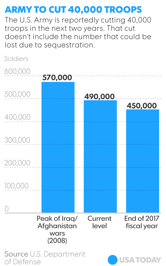 Army plans to cut 40,000 troopsThe U.S. Army is reportedly cutting 40,000 troops in the next two years. That cut doesn't include the number that could be lost due to sequestration. Video provided by Newsy Newslook The Army plans to cut 40,000 soldiers from its ranks over the next two years, a reduction that will affect virtually all of its domestic and foreign posts, the service asserts in a document obtained by USA TODAY. The potential troop cut comes as the "This will not be quick — this is a long-term campaign," Obama said at the Pentagon after meeting top military brass in the wake of setbacks that have prompted critics to call for a more robust U.S. response against the Islamic State. An additional 17,000 Army civilian employees would be laid off under the plan officials intend to announce this week. Under the plan, the Army would have 450,000 soldiers by Sept. 30, 2017, the end of the 2017 budget year. The reduction in troops and civilians is due to budget constraints, the document says. The Pentagon's budget, released in February, envisioned the reduction to 450,000 would occur by Sept. 30, 2018. Some of the cuts were expected. During the peak of fighting in Iraq and Afghanistan, the Army swelled to about 570,000 soldiers to ensure that deployments could be limited to one year. After most troops came home from those wars, the Army planned to shrink. The Army should bottom out at 450,000 soldiers, said Michael